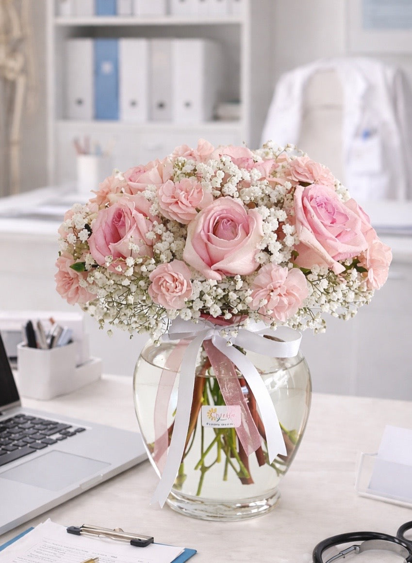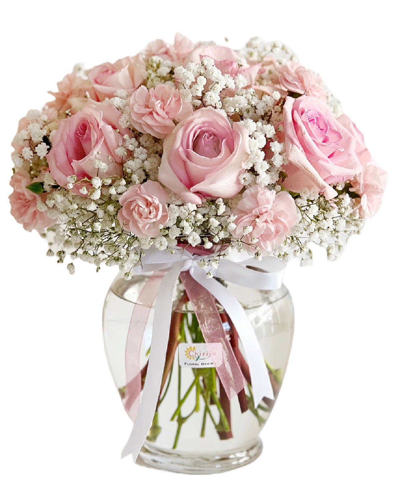 ✔ Premium flowers: Light Pink roses, pink carnations, and baby breath.